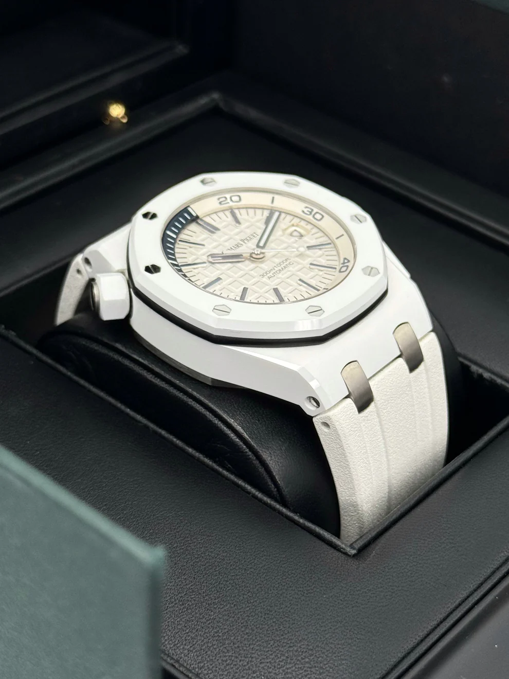 ✔️White dial with “Méga Tapisserie” pattern, white gold applied hour-markers and Royal Oak hands with luminescent coating