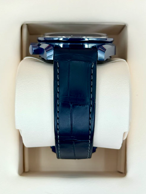 NOTE:The watch features a blue ceramic case complemented by a blue ceramic bezel ring with Liquidmetal tachymeter scale. It is presented on a blue leather strap with a blue ceramic, ceramised titanium foldover clasp.