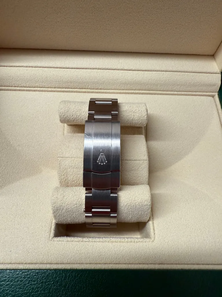 2023 Rolex 41mm Oyster Perpetual Celebration dial. Watch comes as a complete set with outer box, inner box, warranty card, manual, warranty booklet, small leather holder, green Rolex tag, and white Rolex Tag. Watch has never been polished and still had barcode sticker on the side.