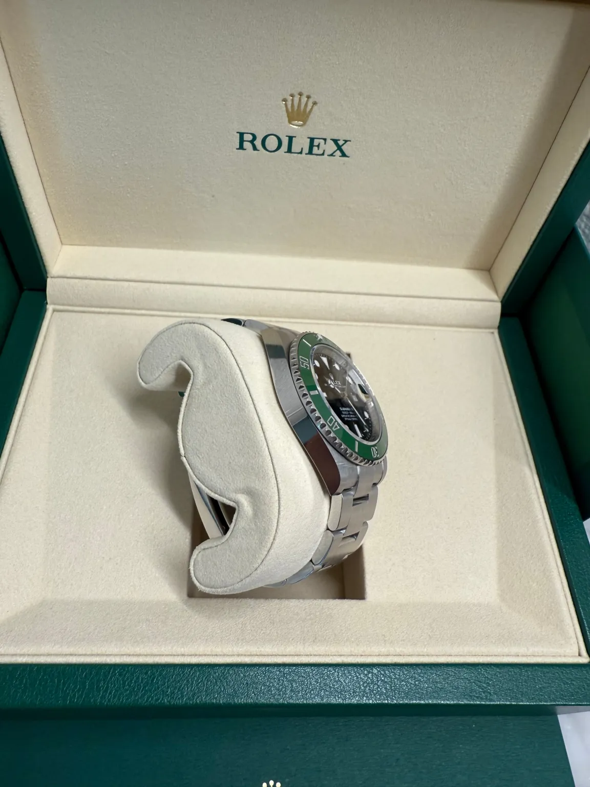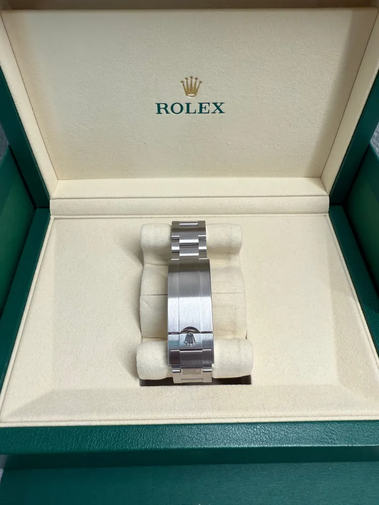 Packaging Outer box, inner box, warranty card, manual, warranty booklet, small leather holder, and green Rolex Tag.
